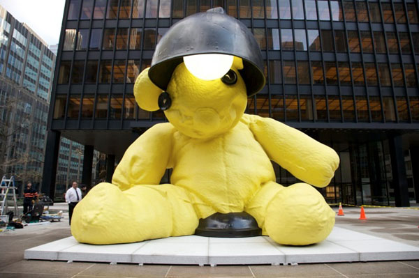 In Chicago, the good people decided to express their wishes to put on hard hats, join the union, and…tell me…what’s that thing between his legs? Obviously GE put this in some Plaza to remind you that you only have THREE more days to enjoy your love with Thomas Edison. And that…big yellow bear…is YOU!