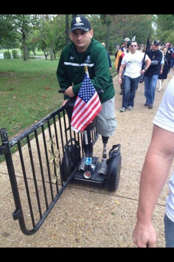 Now, here is a ‘white’ man, stealing barricades and taking them over to the White House to dump. He didn’t actually ‘steal’ this barricade, as he helped pay for it. What he is demanding is his right to the National monuments which belong to the people.