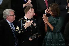 Cory Remsburg is a true American hero. Ten tours in Afghanistan and then— brain damage by a terrorist. Minutes before Obama started talking about him at the end of his State of the Union speech tonight, the first lady was smiling and gently touching him proudly, as if he were a very dear friend of hers. It was the end of Obama’s speech, and Obama choose, to have the whole Congress turn, and applaud this poor man, who had suffered such a terribly injury.