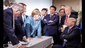 Enforcing the image that since Hillary lost, the woman in charge is Merkel, and here she is seen scolding Trump like a school marm.