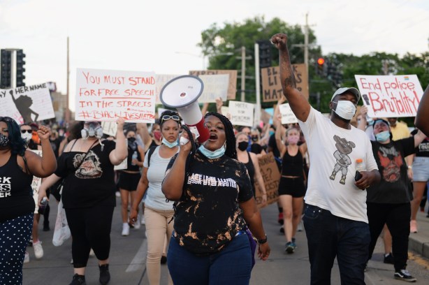 UNIVERSITY CITY, MO – JUNE 12: Missouri Democratic congressional candidate Cori Bush leads protesters as they take to the street to protest against police brutality on June 12, 2020 in University City, Missouri. Protest continue across the world since George Floyd died in Minneapolis police custody on May 25. (Photo by Michael B. Thomas/Getty Images)