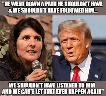 Nikki Haley has decided to run against Trump for President. She is a BIG Neo-Con, with a seat on the board of Boeing, and Kari Lake makes her look like the spoiled meat loaf I left in the fridge from last year. Moldy, and dangerous. Also, moldy and dangerous is the other BUSH guy, Mike Pompeo. (Why do I say Bush you might ask?) War. All RINOS lead to war. (So do all DEMS)