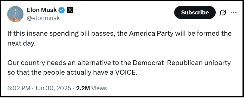 Elon Musk is trying HARD to save America. So, he promises to go after all the MAGA politicians that vote for the bill in the next elections. Trump has really hit Elon hard, trying to destroy his businesses, even his Space X…Trump is now like Biden, doing China’s bidding. Hard to believe but it certainly looks that way.