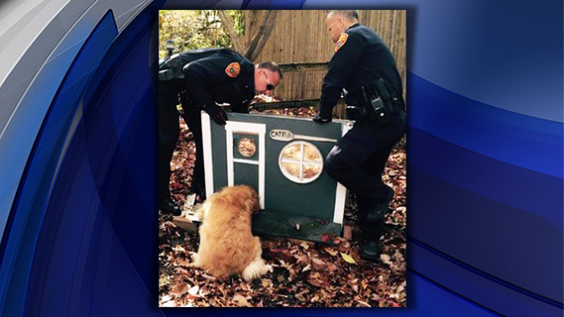 A Golden Retriever was rescued by Suffolk County Police officers Friday morning after he got his head wedged in a cat house in Medford.