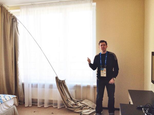 And now, the reporters in Russia are sending pictures of their hotel rooms at the Winter Olympics in Russia, (Which Russia has had two years to get ready) where their hotel rooms lack doors, shower curtains, lobbies, doors, light bulbs, and drinking water.