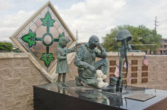 Kalat worked on this memorial night and day for several months. To the left of the kneeling soldier is a small Iraqi girl giving the soldier comfort as he mourns the loss of his comrade in arms.