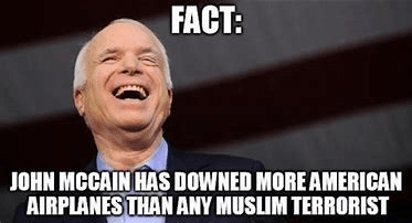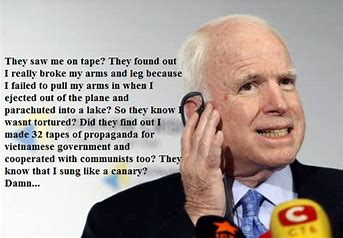 John was damaged by that experience as anybody would be. He came back and abandoned his wife who had stood by him, for another. He admitted that he “broke” under his torture and I have written before about how John McCain breaking under torture affected hundreds of Americans lives. He gave up…a lot of intelligence and info..but hey, he was a patriot!
