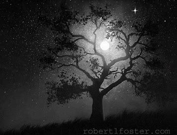 And then, I looked up. There are no leaves on my ‘mother’ tree right now. (I call her mom) So the stars hung on her limbs like a Christmas tree twinkling. The moon was bright, and not quite full yet, in fact it looked kind of goofy.