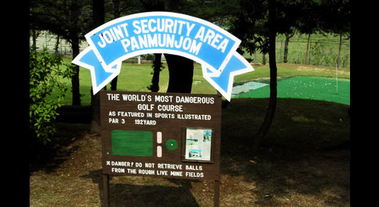 Third: The next day– a real treat! Golf. In pairs of four, everyone will get to play the most dangerous golf course in the world, which sits in the demilitarized zone between North and South Korea. There is only one hole to play: a par three..192 yards, but the rough is filled with land mines! Think of the fun bets you could win by challenging the other team to go in and get his ball!