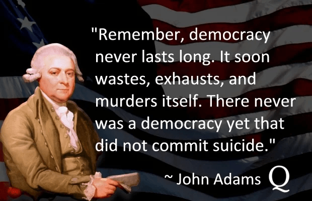 John Adams might want to talk him out of that. You see, what if Elon Musk were the ONE man on Mars who warned the Martians that on order for the planet to survive the next thousand years, and have water to drink, warming the planet up…they would have to blow a few nuclear weapons, rather big ones in fact. And what if the people did not CARE about what happens in a few thousand years? They wouldn’t be alive. So, even though Elon would be right, they could outvote the issue. OR…say there is one man, and two kids…and you have a democratic vote. The man wants the kids to clean their rooms before morning and the kids go “NO…we outvote you. We the people say no. You keep telling us that we have a voice, and we say…video games until we fall asleep.”