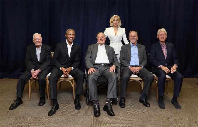 This picture has more meaning thatn you know. Daddy Bush at Center, and Lady Gaga right behind him.